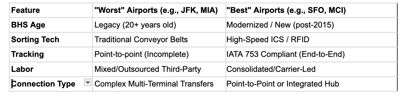 As the table below shows, the fundamental divide between the best and worst airports for baggage handling lies in the transition from legacy manual labor to integrated automation.