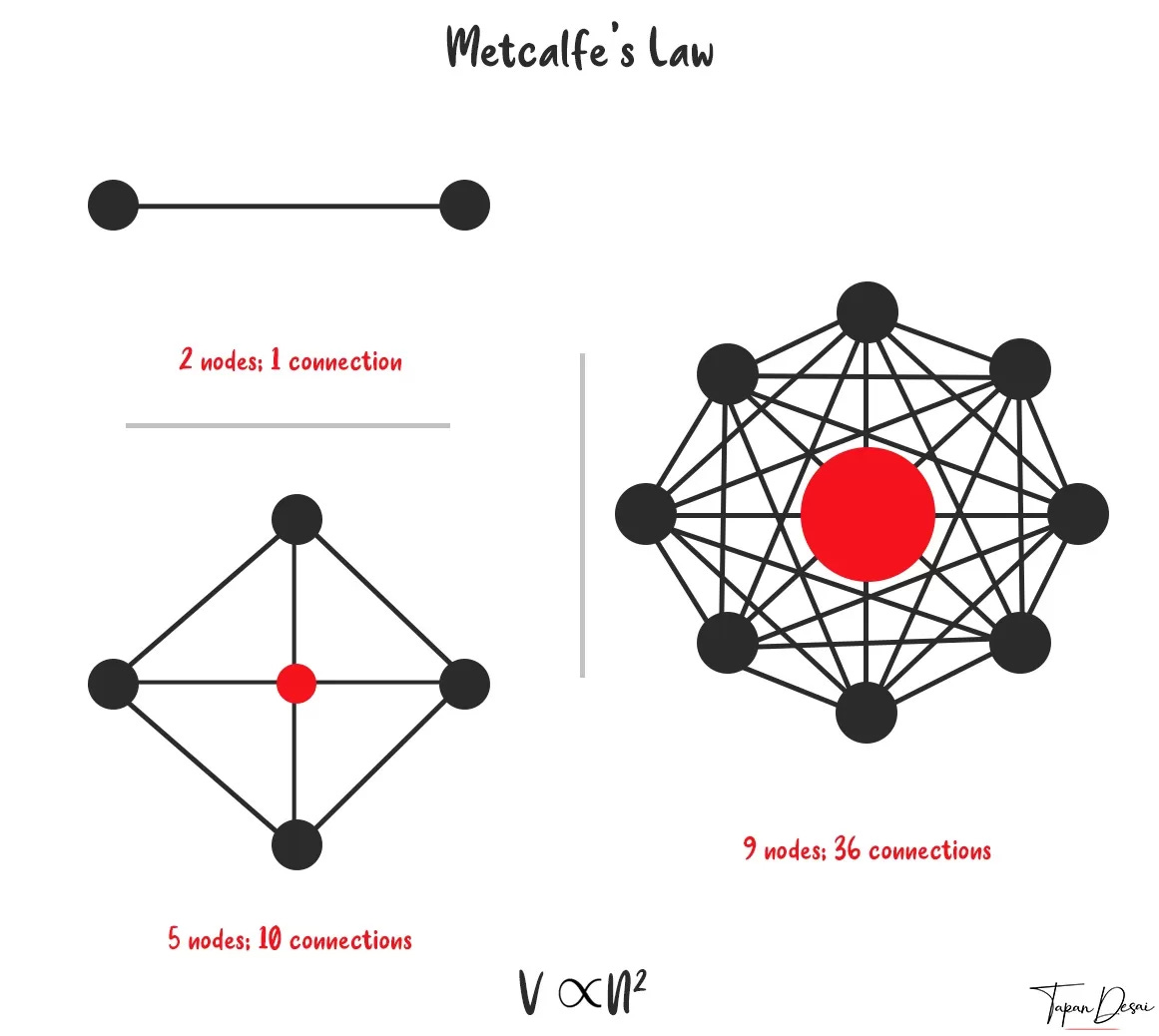 While there are various types of scaling laws related to networks, Metcalfe’s Law is one of the most well-known. Stemming from the fact that the number of connections in a network is n * (n-1)/2, Metcalfe’s law suggests that the value of a network increases in proportion to the square of the number of its users (n^2).