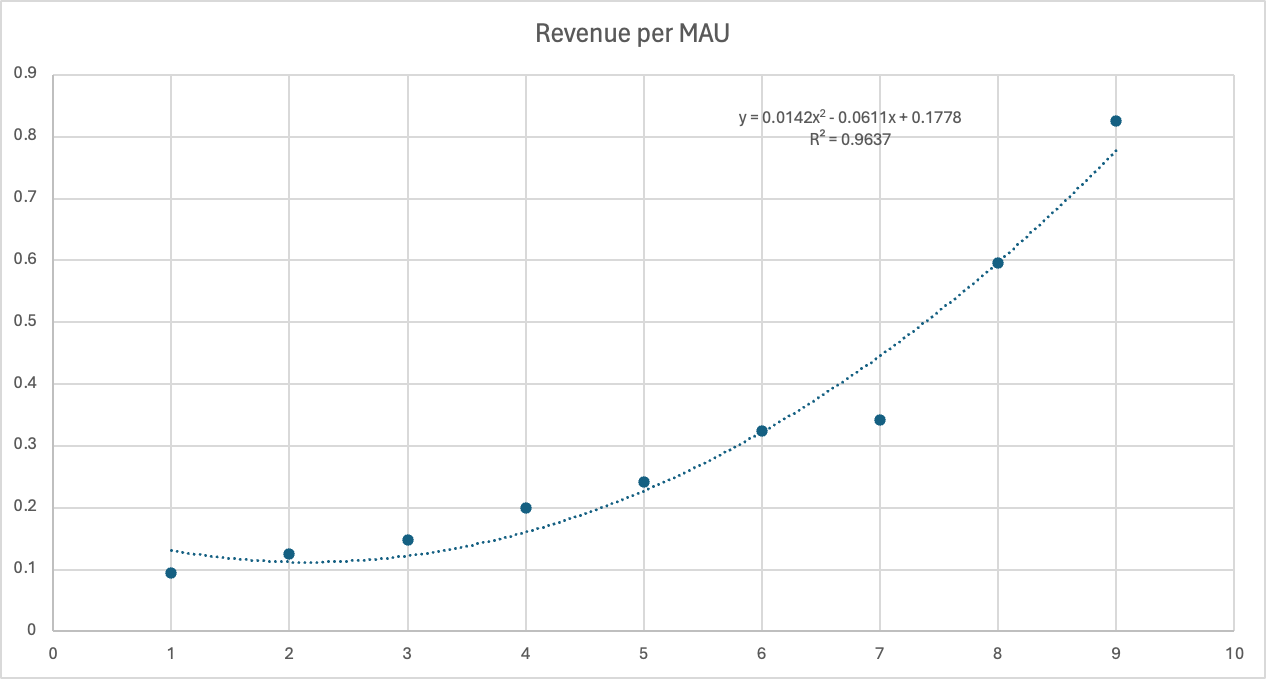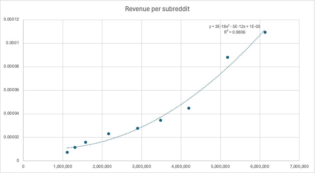 Digging deeper, we can see that the revenue per subreddit is indeed experiencing growth, with a notable pattern of increasing quadratically.