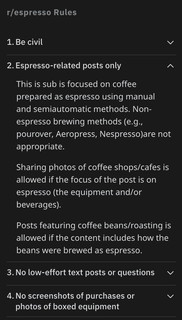 Just to be clear: “This is sub is focused on coffee prepared as espresso using manual and semiautomatic methods. Non-espresso brewing methods (e.g., pourover, Aeropress, Nespresso)are not appropriate.”