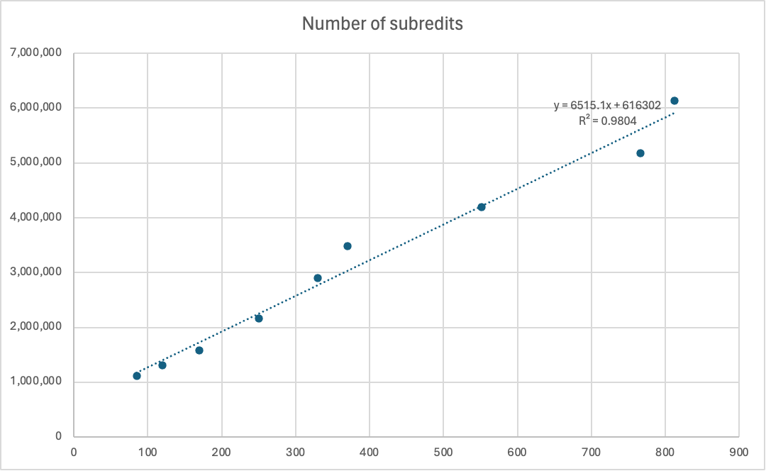 An intriguing observation here is that the number of subreddits is increasing linearly with the number of users. Only linearly!