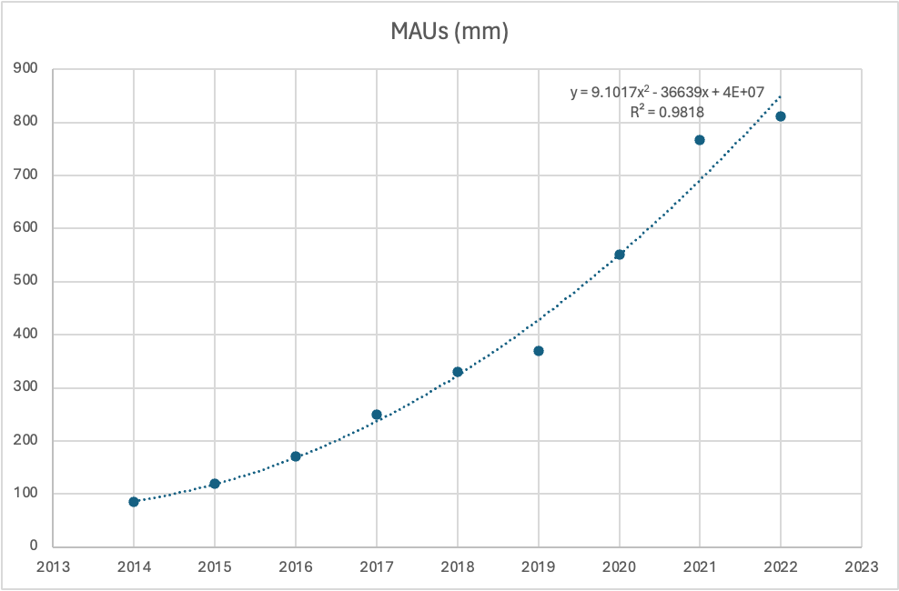 When examining the revenue per monthly active user, it’s noted that information on Daily Active Users (DAU) has been unavailable for more than three years now, necessitating reliance on monthly active user (MAU) data. However, it’s reasonable to assume that the DAU/MAU ratio (which some use as an indicator of user engagement or stickiness) remains relatively stable.