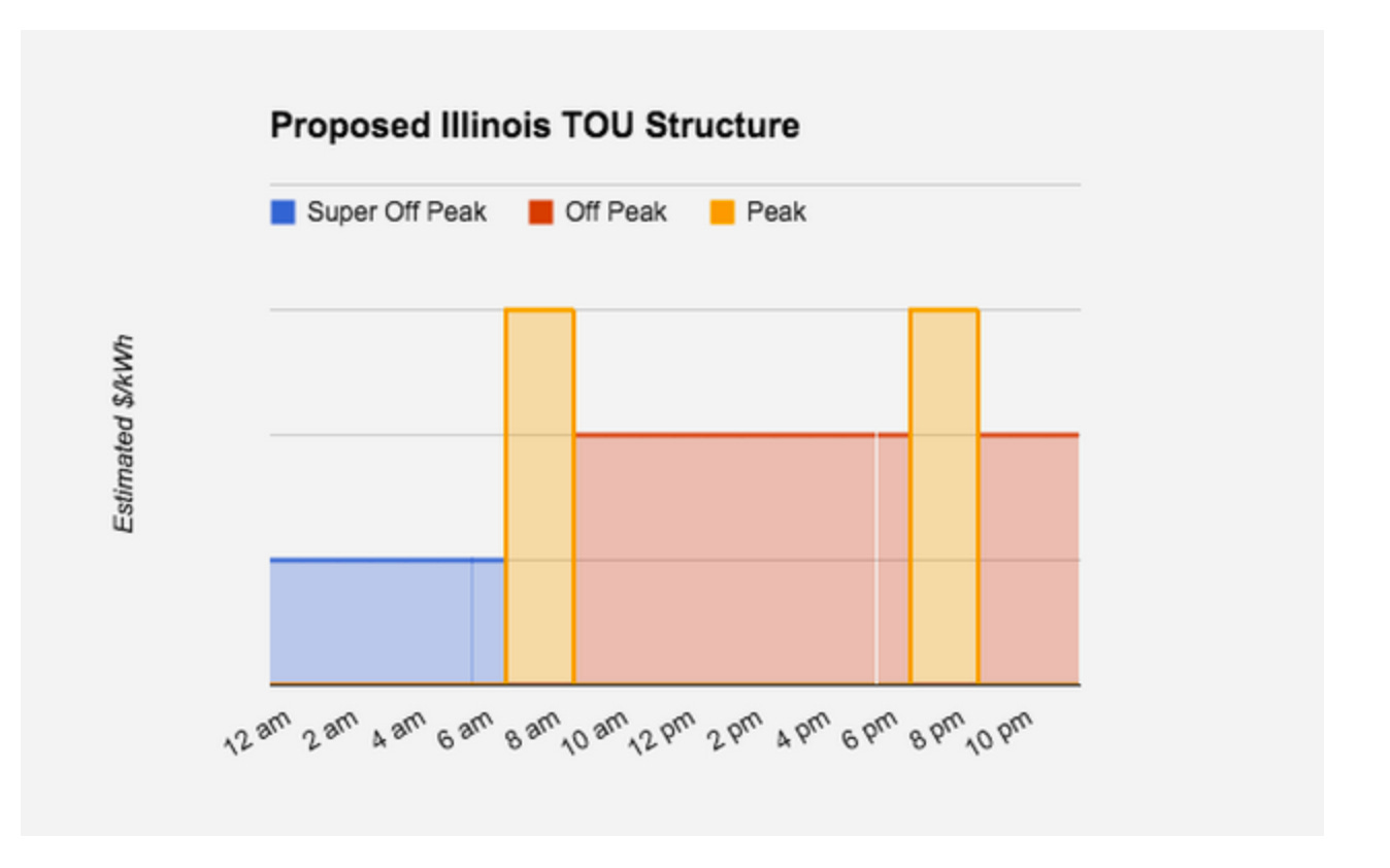 Another place where time-varying prices are used is electricity. For example, in Illinois, the Citizens Utility Board (CUB) and the Environmental Defense Fund (EDF) have submitted a request to the Illinois Commerce Commission, urging that Illinois’ two primary investor-owned utilities be mandated to provide Time-of-Use (TOU) rates. Their proposal includes a three-block rate structure, as outlined in the chart below.