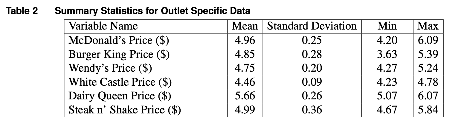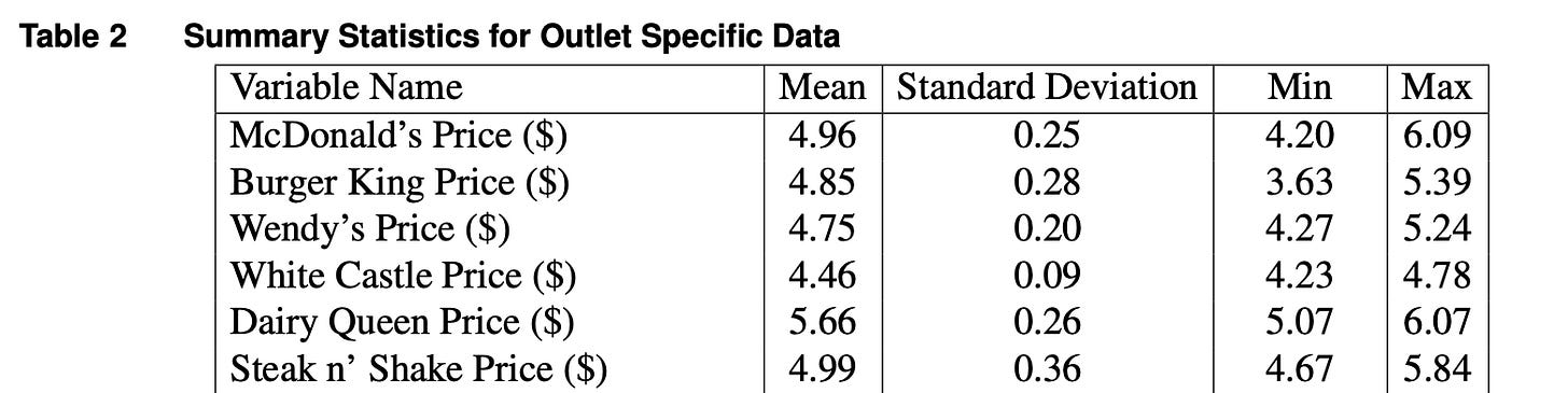 But let me tell you this: One can observe different prices even within the same county. In my paper with Awi Federgruen and Margaret Pierson, “How much is a reduction of your customers’ wait worth? An empirical study of the fast-food drive-thru industry based on structural estimation methods,” we called every single drive-thru location in Cook County (IL) and asked the price of a meal (burger, fries, and a drink) at the time (2011).