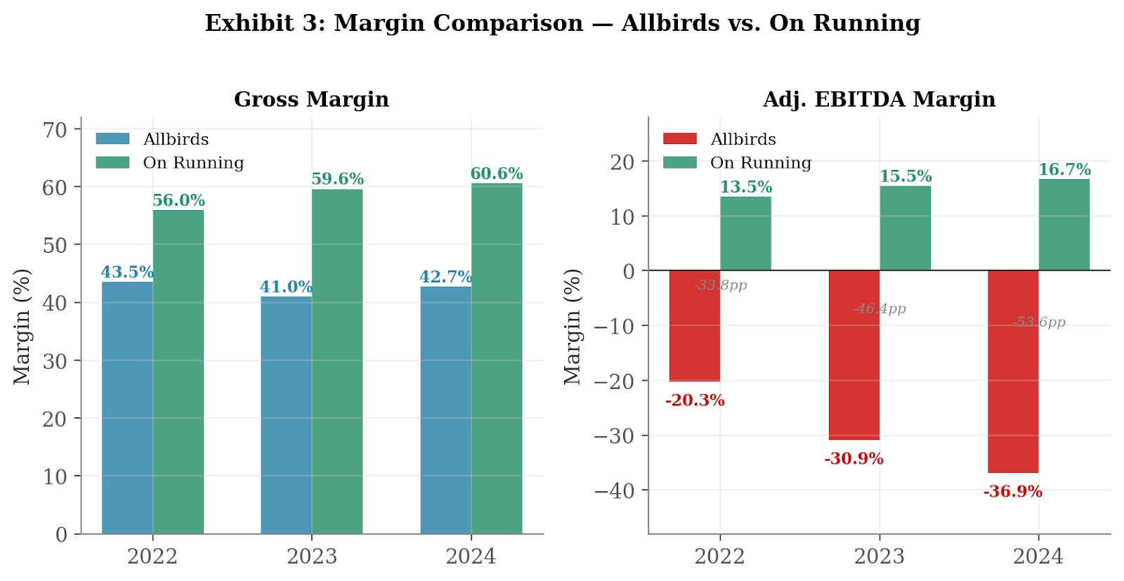 The comparison with On Running is interesting, and frankly, painful. In 2022, On Running posted gross margins of 56.0 percent and adjusted EBITDA margins of 13.5 percent. In 2023, those improved to 59.6 percent and 15.5 percent. In 2024, 60.6 percent and 16.7 percent. On Running’s gross margin was 15 to 18 percentage points higher than Allbirds’ in every year, and its EBITDA margin was positive and expanding, while Allbirds’ was negative and worsening. Both companies sold premium footwear to affluent, style-conscious consumers. One had a cost structure that worked. The other did not.