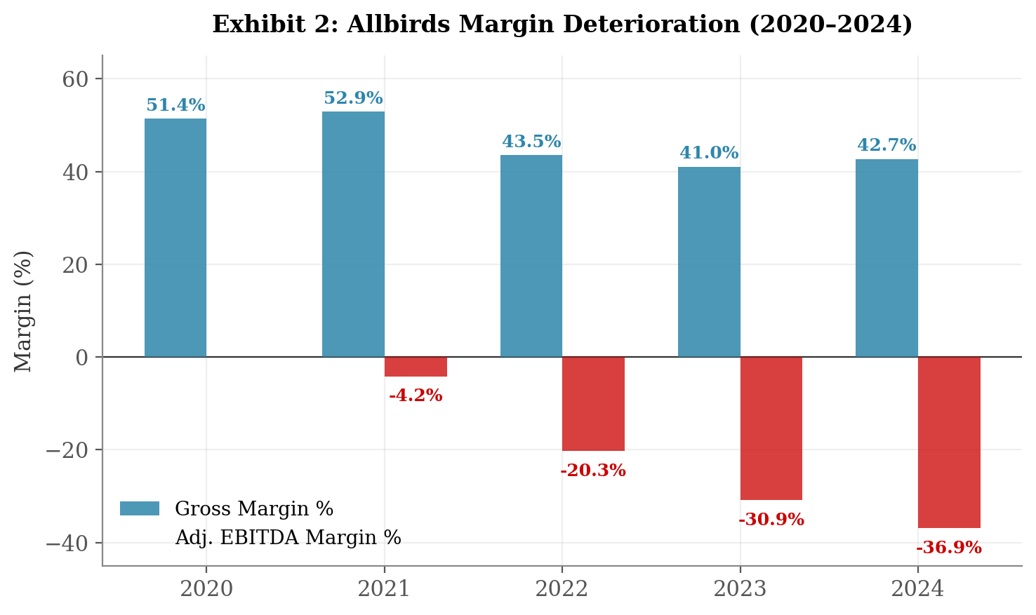 Allbirds had declining revenue, rising SG&A as a percentage of that revenue, deteriorating EBITDA margins, a product with known quality issues, and a competitive position that was weakening quarter by quarter. The losses were not an investment in future profitability. They were the steady bleed of a business model that did not work at scale.
