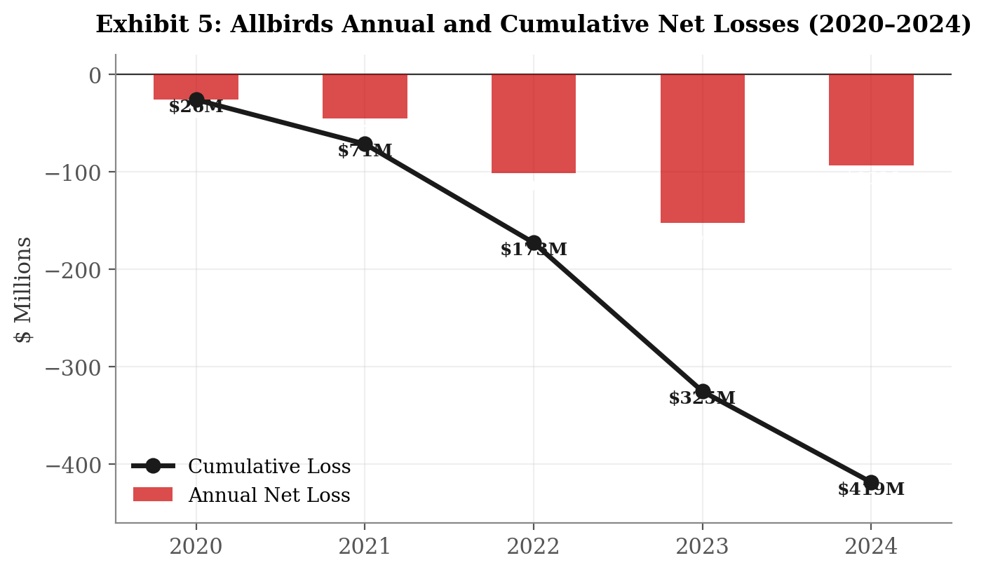 The cumulative damage is staggering. Over the five fiscal years ending in December 2024, Allbirds lost $419 million on $1.24 billion in total sales, a blended net loss margin of approximately 34%. The net loss was $45.4 million in 2021, $101.4 million in 2022, $152.5 million in 2023, and $93.3 million in 2024. The narrowing in 2024 was driven entirely by cost cuts, store closures, headcount reductions, and marketing pullbacks — rather than improved fundamentals. Revenue continued to decline even as expenses were slashed.